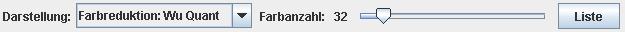 In diesem Modus wird eine Farbreduktion nach dem Verfahren von Xiaolin Wu ("Color quantization by dynamic programming and principal analysis") durchgeführt, das zu den besten Farbquantisierungsverfahren zählt. Die Anzahl der Farben lässt sich mit dem Regler "Farbenanzahl" einstellen. Das Bild wird mit den ermittelten Farben dargestellt. Durch das Drücken auf den Knopf "Liste" lassen sich die ermittelten Farben als Tabelle ausgeben. Hierbei werden die Farbwerte und ihre absoluten und relativen Häufigkeiten angegeben. |