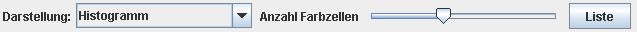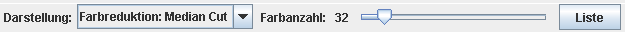 In diesem Modus wird eine Farbreduktion nach dem Median Cut Algorithmus durchgeführt. Die Anzahl der Farben lässt sich mit dem Regler "Farbenanzahl" einstellen. Das Bild wird mit den ermittelten Farben dargestellt. Durch das Drücken auf den Knopf "Liste" lassen sich die ermittelten Farben als Tabelle ausgeben. Hierbei werden die Farbwerte und ihre absoluten und relativen Häufigkeiten angegeben. |